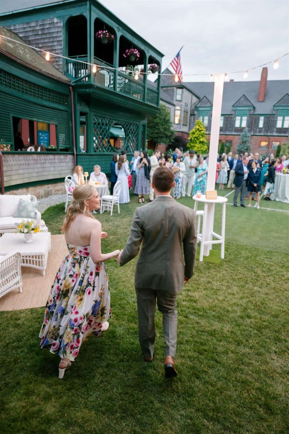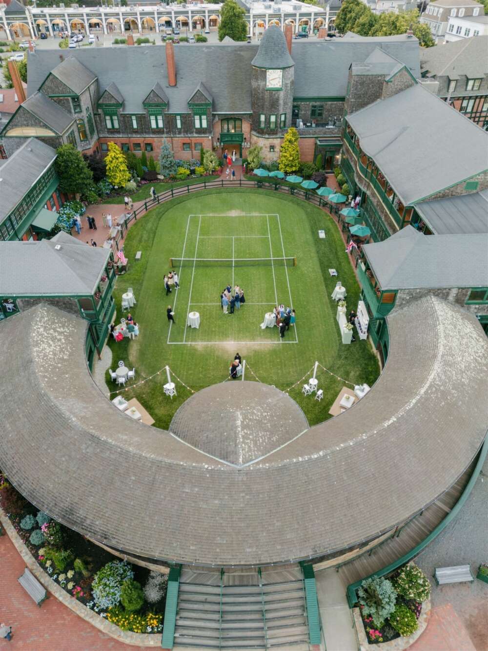 As guests step through the brick archway off Bellevue Avenue and follow the red brick pathways into the venue, they’re immediately transported from the bustle of downtown into a lush space that signals history and prestige. Sweeping manicured grass courts are surrounded by architecture that exudes Newport’s character, and together create an atmosphere that feels both intimate and celebratory.