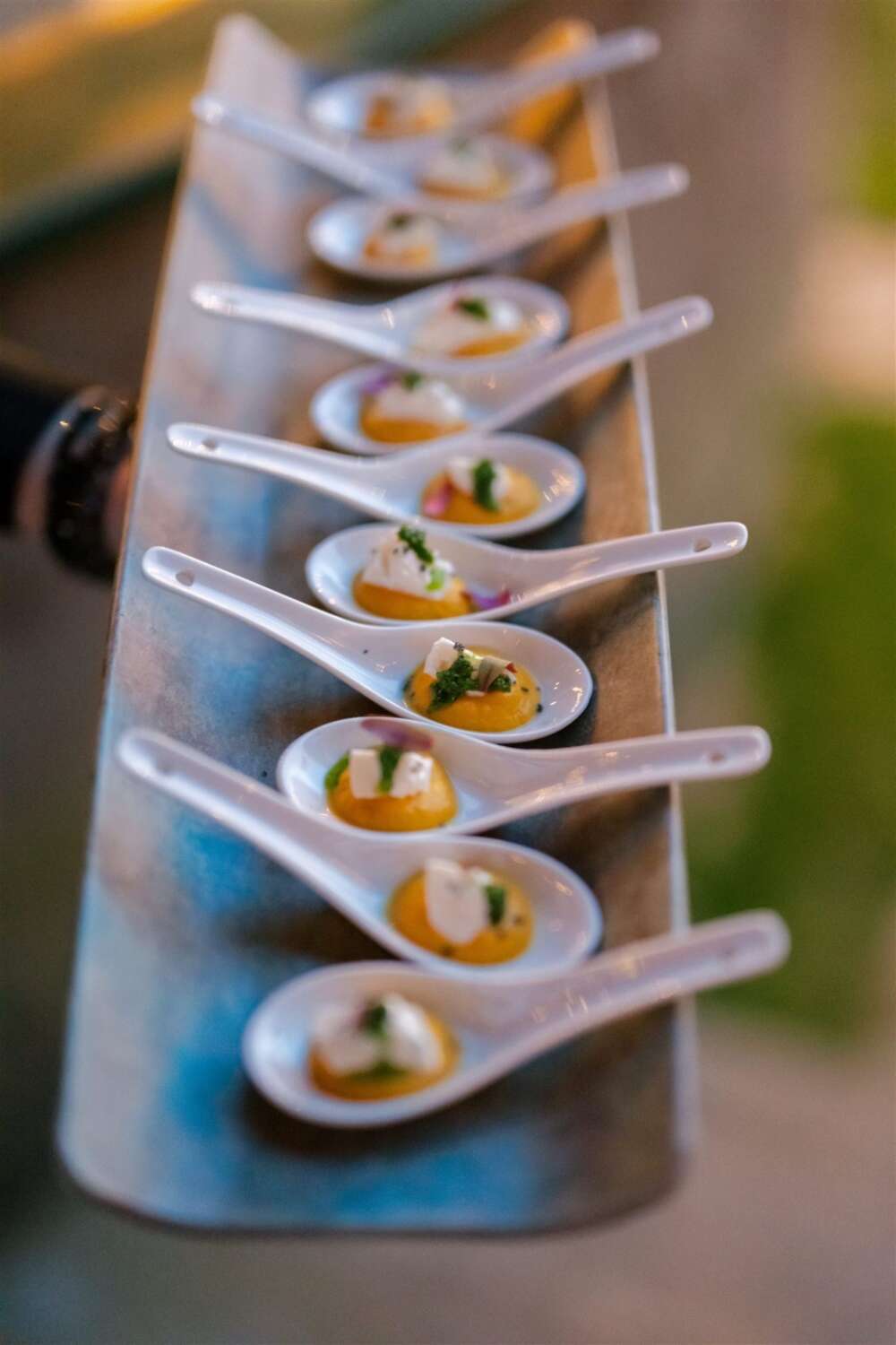 For this venue, our chef team recommends a menu that celebrates the flavors of the season, and highlights Newport’s coastal charm. Fresh seafood, seasonal produce, and creative presentation come together to create a dining experience that’s elegant yet approachable. Couples can continue to draw on tennis inspiration in the food presentation, with hors d’oeuvres served on vintage tennis rackets, and food pairings and garnishes that echo the colors of the court. Our team always considers how the menu will play into the overall design story of your event, infusing personality while fostering a seamless experience for your guests.