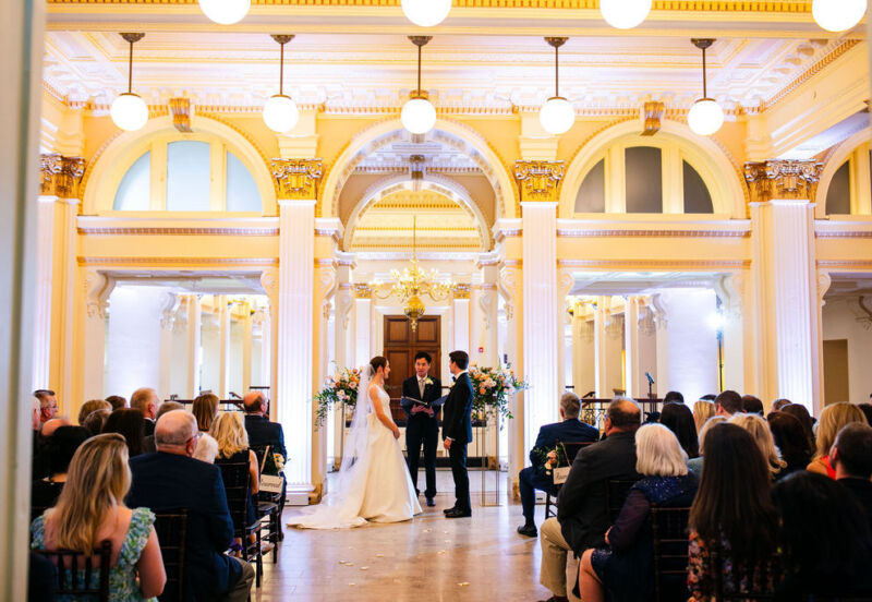 The stately Grand Hall overlooking the indoor Garden Courtyard makes for a breathtaking entrance to your event. The hall’s original arched clerestory windows and skylights create a dramatic light-filled space. Classical detailing and artistry abound, from intricately hand-carved floret adornments to rich-toned, marble-paved flooring. The Grand Hall is most commonly used for wedding ceremonies and cocktail hour.